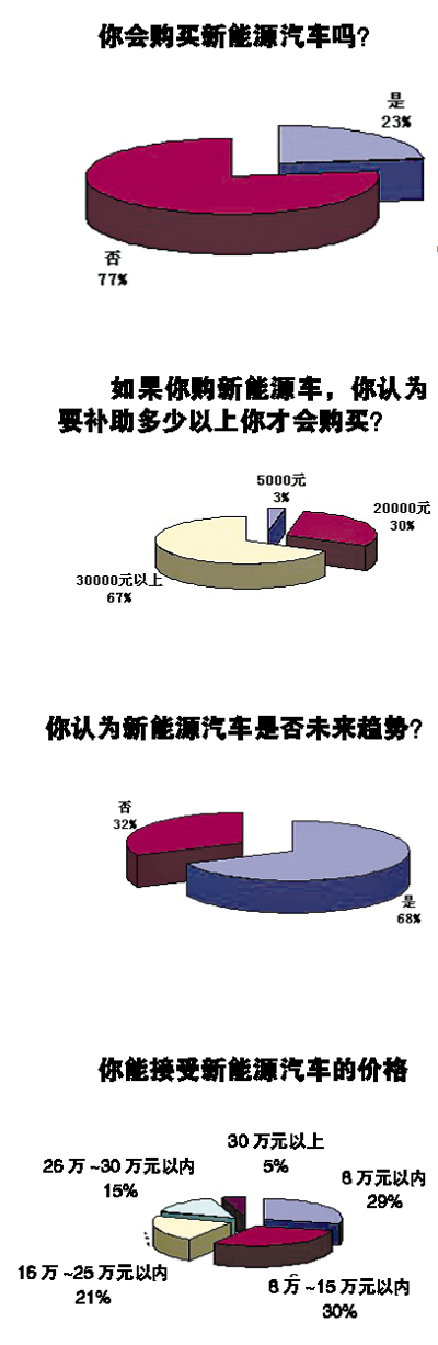 就新能源汽車(chē)目前的現(xiàn)狀,記者向近100位讀者做了調(diào)查,很多消費(fèi)者在接受調(diào)查時(shí)表示,新能源車(chē)的技術(shù)還不成熟,但是目前的新能源車(chē)價(jià)格卻很高,對(duì)于普通的消費(fèi)者來(lái)說(shuō),還不如買(mǎi)一部普通的用油小車(chē)。