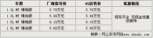 據(jù)長城汽車4S店銷售人員介紹,長城凌傲車型目前1.3L鋒銳版、1.3L鋒尚版、1.5手動(dòng)鋒銳版和1.5手動(dòng)鋒尚版有現(xiàn)車,顏色比較齊全。全系沒有任何優(yōu)惠,顧客到店購車可以贈(zèng)送裝飾。