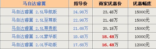 馬自達6睿翼與馬自達6同配置車型始終保持著萬元以上的差距,編輯覺得這樣的定價不錯,豐儉由人,可以照顧到更多的客戶。2.0L排量車型的加入使得睿翼銷量有所改善,相比起2.5L車型,性價比更高一些。