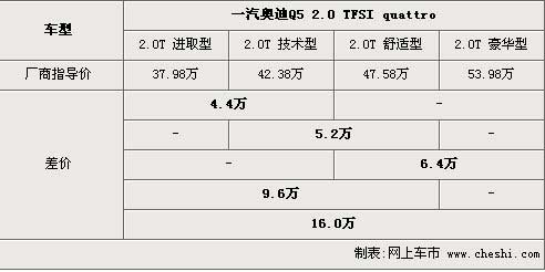 國產(chǎn)版奧迪Q5分為2.0T進(jìn)取型、2.0T技術(shù)型、2.0T舒適型以及2.0T豪華型4款車型,售價(jià)區(qū)間為37.98-53.98萬元。如上圖所示,4款車型中的最低差價(jià)為4.4萬元,而最高差價(jià)則高達(dá)16萬元。