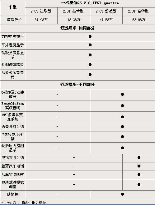 往往全系車輛的價(jià)格差異差的最多的就是在豪華娛樂(lè)配飾上面,奧迪Q5當(dāng)然也不例外。奧迪Q5舒適型以及豪華型配備了奧迪的第三代MMI多媒體交互系統(tǒng),通過(guò)精簡(jiǎn)控制器,MMI可以迅速、方便、直觀地使用大量的功能和技術(shù)。播放器選用了帶有DVD功能的6碟CD系統(tǒng),而音響也是選用了丹麥的頂級(jí)音響品牌Bang&Olufsen,綜上幾個(gè)配置,都是在進(jìn)取型以及技術(shù)型上看不到的配置。頂配的豪華版車型,相比其他3款車型則多了電視接收系統(tǒng)、藍(lán)牙汽車電話等高科技味道十足的娛樂(lè)設(shè)備,而可以調(diào)節(jié)減震阻尼軟硬的奧迪駕駛模式系統(tǒng),也是只在頂配的豪華版車型上共享的。