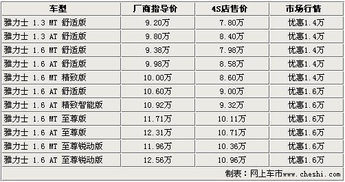 雅力士是一款在國內(nèi)非常受歡迎的A0級(jí)小車,從這款車的配置、安全性方面,都是一款值得購買的小車。根據(jù)網(wǎng)上車市價(jià)格監(jiān)測系統(tǒng)顯示,近期雅力士最高優(yōu)惠1.6萬元,目前有部分型號(hào)的現(xiàn)車供應(yīng)。具體車型行情如下: