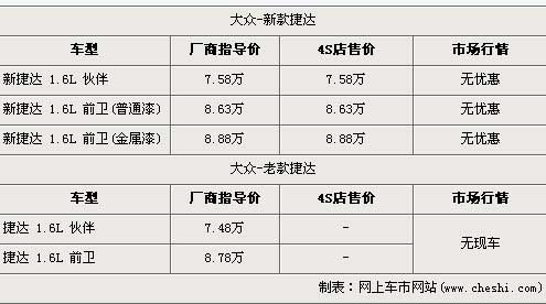 據(jù)北京一汽大眾經(jīng)銷店銷售人員介紹,大眾全新捷達(dá)1.6L分為伙伴版以及前衛(wèi)版兩種車型,售價(jià)分別為7.58萬(wàn)元和8.88萬(wàn)元,由于前衛(wèi)版白色車型采用的是普通漆油料,所以在廠商指導(dǎo)價(jià)方面會(huì)比前衛(wèi)版其他顏色車型便宜2500元,售價(jià)為8.63萬(wàn)元。銷售人員還介紹,老款的大眾捷達(dá)已經(jīng)沒(méi)有現(xiàn)車,消費(fèi)者已經(jīng)無(wú)法購(gòu)買到。