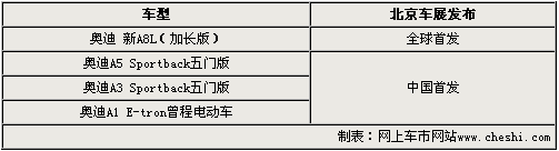 奧迪新一代A8車型雖然已于去年底正式發(fā)布,但其為中國(guó)消費(fèi)者量身訂做的加長(zhǎng)版-新A8L將在國(guó)人面前全球首發(fā)。奧迪A5 Sportback五門版、奧迪A3 Sportback五門版車型,將于今年正式以進(jìn)口身份引入國(guó)內(nèi)。而奧迪A1 E-tron曾程電動(dòng)車作為一款節(jié)能減排的概念車,將向人們展示其獨(dú)特的性能和環(huán)保技術(shù)。
