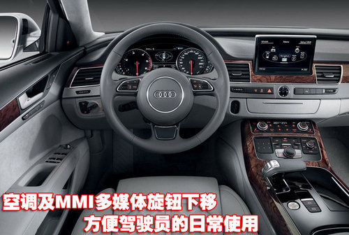 在內(nèi)飾方面,大燈開關(guān)、外后視鏡調(diào)節(jié)旋鈕以及電子手剎等大量鍍鉻飾件的應(yīng)用,不僅提升視覺效果的同時,也進一步提升了整車的檔次。此外,中控臺上的空調(diào)及MMI多媒體影音系統(tǒng)旋鈕均被下移,并與中空臺形成一定的角度,方便駕駛員的日常使用。