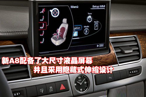 奧迪新A8配備了大尺寸液晶屏幕,并且采用隱藏式伸縮設(shè)計。除通過座椅上的按鈕調(diào)節(jié)座椅外,還可以通過液晶屏幕上的相關(guān)圖示進行坐姿選擇。除此之外,中控臺上的復(fù)古式指針石英表也凸顯了奧迪新A8的華貴。