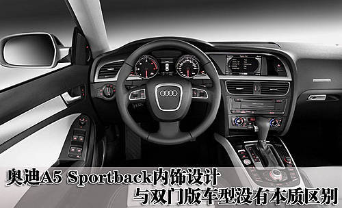 奧迪A5 Sportback四門(mén)轎跑車擁有與奧迪A系家族車型一致的內(nèi)飾設(shè)計(jì),最大的區(qū)別在于車廂布局上。銀白色的金屬裝飾條和黑色防反光儀表板,突出時(shí)尚與動(dòng)感的視覺(jué)效果,甚至在車頂和座椅的色彩選擇上都采用了冷酷的黑色。
