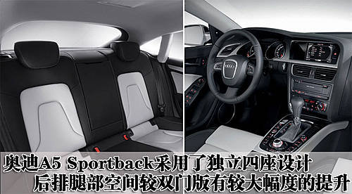 與很多四門(mén)轎跑車一樣,奧迪A5 Sportback四門(mén)轎跑車采用了獨(dú)立四座設(shè)計(jì),前排提供運(yùn)動(dòng)座椅等選裝配置,后排空間尤其是腿部空間表現(xiàn)較雙門(mén)轎跑定位的奧迪A5有較大幅度的提升。