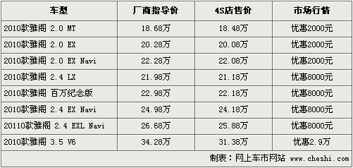 新雅閣一直是日系中級(jí)車型的典型代表,新雅閣憑借其大氣的外觀、舒適的空間和豪華的配置在中級(jí)轎車市場中占據(jù)了一席之地。去年,廣汽本田又對第8代雅閣進(jìn)行了小改款,對原來車型的配置有一定程度提升,部分車型增加了智能鑰匙和后遮陽板等,提高了雅閣整體車型的性價(jià)比。近日根據(jù)網(wǎng)上車市價(jià)格監(jiān)測系統(tǒng)顯示,目前雅閣全系最高優(yōu)惠近3萬元,2.4L現(xiàn)車較齊全。具體價(jià)格以及優(yōu)惠幅度如下:
