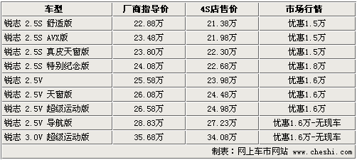 豐田銳志作為一款以運(yùn)動(dòng)著稱的后驅(qū)中級(jí)車,在性能以及操控各方面表現(xiàn)都令人滿意,尤其是獨(dú)具個(gè)性的改裝潛力,讓很多癡迷運(yùn)動(dòng)的車迷們找到了充分的駕 駛樂趣。銳志配備有2.5L和3.0L兩種排量的發(fā)動(dòng)機(jī),同時(shí)超長(zhǎng)的軸距設(shè)計(jì)讓乘員的空間也有了非常理想的狀態(tài)。近日根據(jù)網(wǎng)上車市價(jià)格監(jiān)測(cè)系統(tǒng)顯示,目前 購買銳志車型,最高可享受到1.8萬元的現(xiàn)金優(yōu)惠。具體車型見下表: