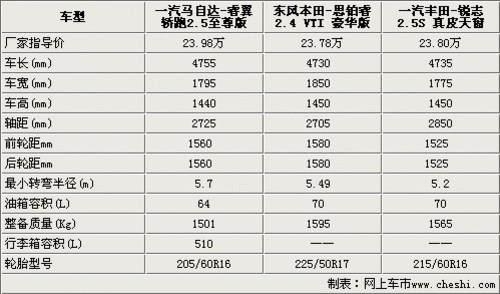 我們選取的三款車型都是位于該車系中黃金排量,售價(jià)都在24萬元左右。在車身尺寸方面睿翼轎跑是三款車型中最長的,同時(shí)睿翼轎跑又是唯一一款采用兩廂半的設(shè)計(jì)車型,這使得睿翼轎跑看起來動(dòng)感十足。豐田銳志的軸距達(dá)到了2850是3款車型中最長的,保證了銳志內(nèi)部空間的寬敞。思鉑睿的前后輪距都要大于睿翼轎跑和銳志,達(dá)到了1580mm。同時(shí)在輪胎寬尺寸上也是最大的,這意味著思鉑睿的操控性能將要優(yōu)越于另外兩款車型。睿翼轎跑、思鉑睿和銳志的轉(zhuǎn)彎半徑都在5米左右。思鉑睿和銳志兩款車型的油箱都是70升,足以應(yīng)付一般家庭的正常使用,睿翼轎跑則要小點(diǎn),容積為64升。