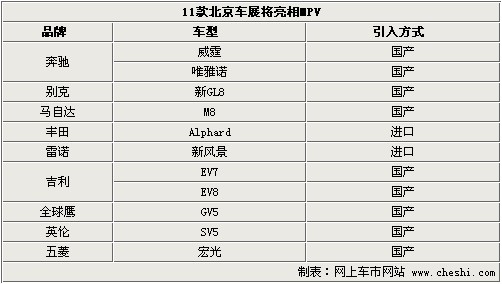 這次在2010北京車展上展出的MPV共有十余款,我們選擇了奔馳、別克、馬自達、雷諾、豐田、吉利、全球鷹、英倫、五菱共9個品牌11款車型。在國內(nèi)知名度相對較高的車型有別克GL8,馬自達8以及五菱宏光。下面將為您奉上這十余款車型的詳細(xì)介紹,希望您能夠喜歡。