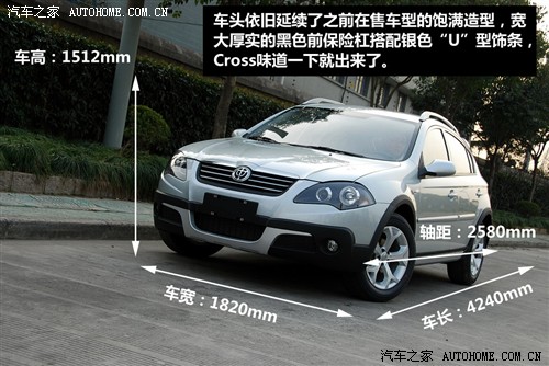駿捷Cross的車身尺寸為4240mm×1820mm×1512mm,軸距依然為2580mm,與原型車駿捷FRV相比,除了底盤升高了20mm之外,中華駿捷Cross加裝了前后大包圍,標(biāo)配的全鋁制車頂行李架和蜂窩狀的進(jìn)氣格柵增加了動(dòng)感和活力,輪轂由FRV的15寸升級(jí)為16寸的鋁合金輪轂,在增強(qiáng)視覺效果的同時(shí),也使檔次得到一定提高。