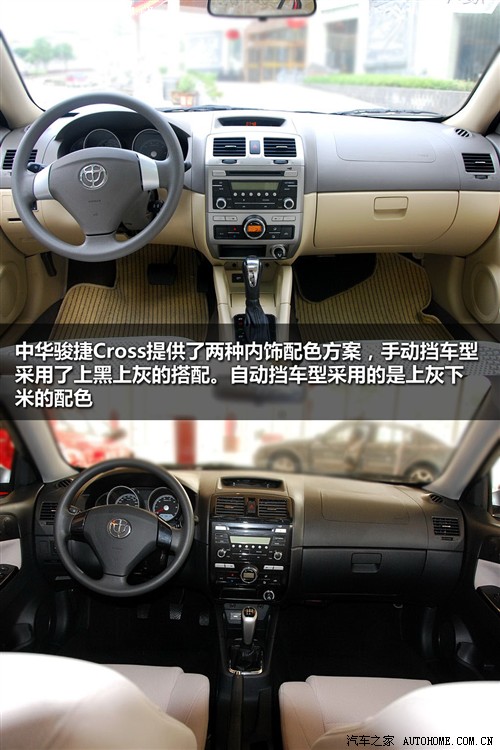 與個(gè)性的外觀相比,駿捷Cross在內(nèi)飾上似乎并沒有體現(xiàn)出什么特點(diǎn),呈現(xiàn)的一派典型的轎車化風(fēng)格,做工在自主品牌里面算是比較出色的,而且樣式也絕對(duì)不亞于同價(jià)位的合資車型,其中手動(dòng)擋車型采用的是上黑下灰的配色方案,而自動(dòng)擋車型則為更接近結(jié)局的上灰下米的色彩搭配。