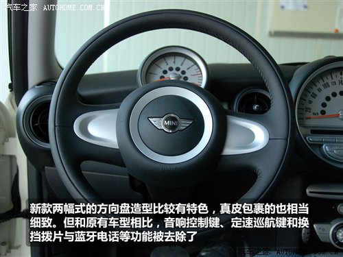 此外,兩輻式的方向盤造型改變對于熟悉MINI的人來說就需要時(shí)間去適應(yīng)了,造型的改變和價(jià)格沒什么直接的關(guān)系,關(guān)鍵在于多功能按鍵也隨之消失了,原來的音響調(diào)節(jié)、定速巡航和車載電話功能都不再能看到。看到這里你可別不高興,要知道這些都有裝備的車型就不是這個(gè)價(jià)了,要30萬以上才行。