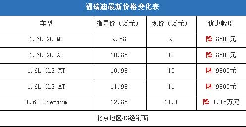 近日,編輯從北京地區(qū)東風(fēng)悅達(dá)起亞4S經(jīng)銷商處了解到,福瑞迪1.6L車型的現(xiàn)車充足,目前購車最高可以優(yōu)惠1.1萬元,性價比很不錯。據(jù)經(jīng)銷商透露,消費(fèi)者要想以這個價格提車,需要在店內(nèi)做購車一條龍服務(wù),車輛商業(yè)險可以打9折。