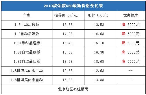 近日,編輯從北京地區(qū)上汽汽車4S經(jīng)銷商處了解到,榮威550全系車型的現(xiàn)車比較充足,購車可以優(yōu)惠3000元左右。據(jù)經(jīng)銷商介紹,在春節(jié)期間推出的榮威550賀歲版在世博會到來之際改名為“世博風尚版”繼續(xù)銷售,因為賀歲版車型的性價比較高,沒有大幅度的現(xiàn)金優(yōu)惠。店內(nèi)銷售人員介紹,如果不需要現(xiàn)金優(yōu)惠,消費者在店內(nèi)可獲贈世博版大禮包,有機會免費參加上海世博會。