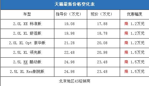 近日我們從東風(fēng)日產(chǎn)北京海潤嘉4S經(jīng)銷商處了解到,天籟的現(xiàn)車充足,顏色也比較全,不過以銀色和黑色為主。如果部分車型需要預(yù)定,等待的時(shí)間為1個(gè)月左右,定金為2000元。目前2.0L排量車型可以優(yōu)惠1.2萬元,2.5L排量車型可以優(yōu)惠1.5萬元。
