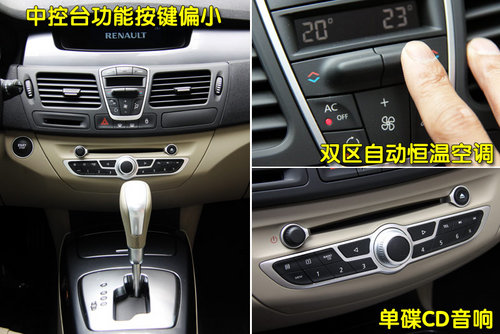 中控臺(tái)中細(xì)小的按鍵不知道法國(guó)人何時(shí)能夠?yàn)榇烁淖円幌,想?dāng)初進(jìn)入到C5車(chē)內(nèi)時(shí),被琳瑯滿(mǎn)目的小按鍵搞的暈頭轉(zhuǎn)向,并且在駕駛時(shí)我是不敢隨意去觸碰那個(gè)區(qū)域的。不過(guò)還好拉古那中控臺(tái)按鍵并不是很多,空調(diào)區(qū)域的造型很時(shí)尚,也很節(jié)省空間,實(shí)際操作也非常容易上手,調(diào)節(jié)方式也很簡(jiǎn)便。另外老款的拉古那配備的是多碟CD,而新款車(chē)型裝配的則是單碟CD音響,在日常使用中,多少會(huì)有一些不便。