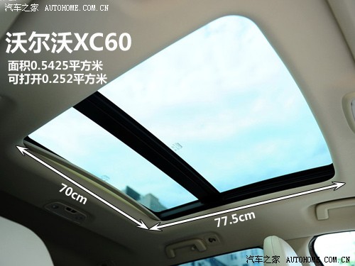 XC60的天窗為整體式,但是面積和Q5比起來(lái)就要明顯小很多,它的整體面積為0.797平米,可以打開(kāi)的縱向長(zhǎng)度不大,為36cm,可打開(kāi)的面積為0.252平米?梢钥吹,從這個(gè)可打開(kāi)面積上看,比前面的Q5和GLK都明顯要差。坐在后排的話,天窗能延伸的位置僅到后排乘客面前一些位置。