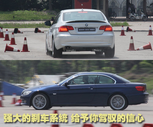 根據(jù)廠家提供的資料顯示,寶馬3系雙門轎跑/敞篷跑車前懸加長了29毫米,后懸加長了3毫米。前導流板的側面造型也進行了改進,前端較以前探出更多,以提高行人的安全性。試駕過程中,給我的感覺懸架要比寶馬3系四門轎車略軟,沒有了明顯的“砰砰車”的感覺。這可能與換裝普利司通的輪胎有一定的關系,雖然感覺懸架略軟,但是絲毫沒有影響操控性。