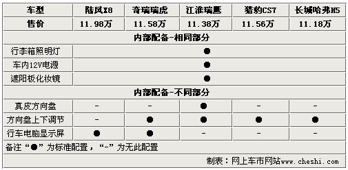 既然是一款SUV,我們就不能以評價轎車的標(biāo)準(zhǔn)來衡量它,畢竟造車的出發(fā)點是不同的。SUV車型更看重內(nèi)部載人載物的能力、駕駛安全性等能力。一些時尚新鮮的內(nèi)部配置我們還是留著在轎車上體驗吧。三款車的內(nèi)部都配備了行李箱照明燈、12V電源和遮陽板化妝鏡。但是在5款車中,僅有瑞鷹為使用者提供了更顯檔次的真皮方向盤。