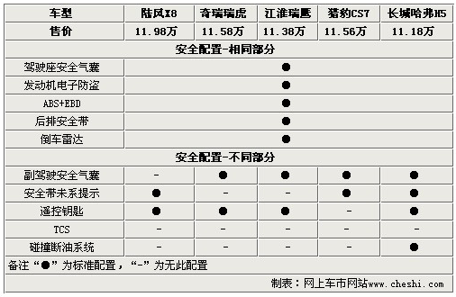安全方面5款車都做得還算到位,前排雙安全氣囊只有X8沒有全部提供,而發(fā)動機電子防盜、ABS+EBD、后排安全帶、到車?yán)走_(dá)這些日趨普及的安全措施,5款車全部配備。剛剛上市的哈弗H5還配備了一項區(qū)別于其他車型新功能-碰撞斷油系統(tǒng),通過名字我們就可以知道它的主要作用是什么。