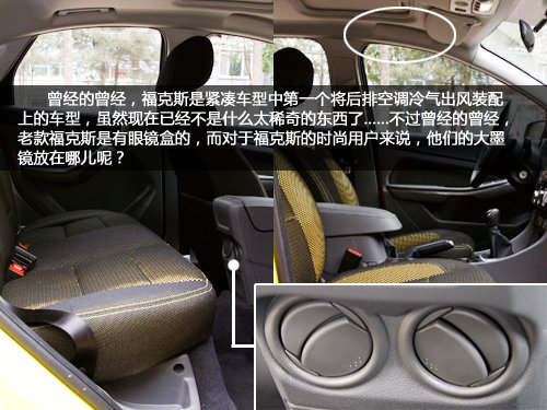 福克斯是國內(nèi)第一款在后排加裝空調(diào)出風(fēng)口的緊湊型轎車,雖然在現(xiàn)在已經(jīng)不是什么大不了的設(shè)置,但是貼心的設(shè)計還是不錯的。不過沒有眼鏡盒是讓編輯我這個四眼感覺很不爽的,畢竟老款?怂故菐в醒坨R盒的。