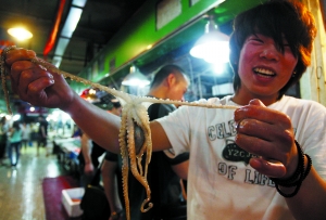 記者昨日來到京深海鮮市場(chǎng),發(fā)現(xiàn)很多攤位都出售章魚,活章魚價(jià)格每斤30元左右,死章魚每斤15元左右。據(jù)一家攤主介紹,自從世界杯捧火了章魚保羅后,最近總有客人來詢問是否有章魚賣。原來市場(chǎng)里僅有兩三家賣章魚的,而世界杯后,不少攤位都增加了章魚生意。
