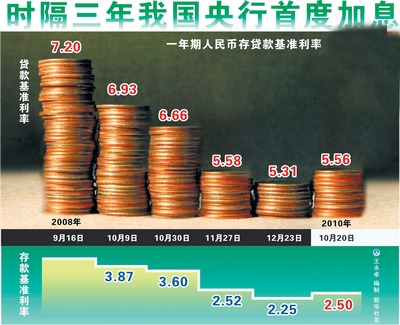 出乎市場的意料,中國人民銀行19日晚間突然宣布,自2010年10月20日起上調(diào)金融機(jī)構(gòu)人民幣存貸款基準(zhǔn)利率。這是我國央行時隔3年后的首度加息,央行為何選擇此時加息?加息是否意味貨幣政策突變?加息對金融市場和房地產(chǎn)市場將產(chǎn)生怎樣的影響,新華社記者就此采訪了相關(guān)的專家和學(xué)者。