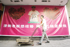 “潦倒老板想結(jié)婚,哪個紅娘愿幫我!弊蛉丈衔,一塊印有征婚內(nèi)容的彩色巨大噴繪橫幅驚現(xiàn)渝北區(qū)兩路一處串串香門面外,橫幅上印有征婚者肖像及聯(lián)系方式,仔細(xì)一看,征婚者身上竟然標(biāo)注為“百萬負(fù)翁”。上前打探得知,原來征婚者就是這家串串香店的老板,由于4年前做生意虧損,欠下上百萬債務(wù),如今他想通過征婚找到另一半與自己共渡難關(guān)。
