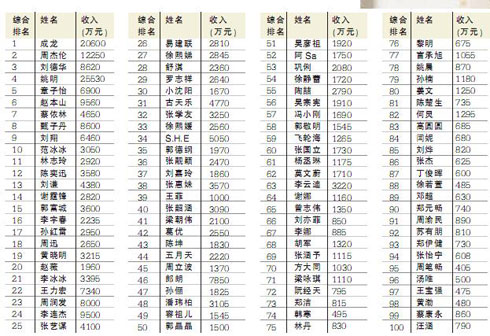 本次榜單前三名均來自港臺地區(qū),56歲的功夫巨星成龍登上榜首,去年5月他成為在“鳥巢”舉辦個唱的第一人,150多名明星嘉賓輪番登臺,觀眾超過7.5萬人。周杰倫位居第二,沒有新唱片并不影響商家和粉絲的追捧,他努力嘗試新的影視作品,有得有失。排在第三位的劉德華出演了3部電影,由于婚事曝光備受關注。今年雖共有43位明星來自港臺,但其成就卻都仰仗于大陸市場。在他們眼中,兩岸三地之間的界限越來越模糊。小巨人姚明仍穩(wěn)居大陸第一名。章子怡緊隨其后,雖然飽受爭議仍獲得25個封面報道。
