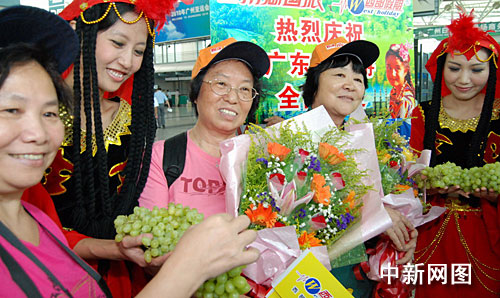 中新網(wǎng)廣州7月31日電 (莫非 林月明)在廣州白云機(jī)場出發(fā)廳,身著漂亮維族服飾的姑娘熱情地將繽紛美麗的鮮花送給游客,盛情邀約廣東游客赴美麗的新疆旅游。這是自“7·5”事件后,廣東首批赴新疆旅游的游客上航班前經(jīng)歷的一幕,意味著暫時停滯了近一個月的廣東新疆游市場,終于全面恢復(fù)正常。