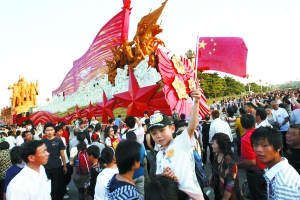 “黃金周”期間,天安門廣場人流如織,中外游客超過820萬人次,超過2008年國慶黃金周北京接待的游客總?cè)藬?shù)。北京市旅游局統(tǒng)計,北京203個主要景點(diǎn)接待游客的總量突破了950萬人次。