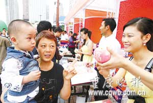 昨天的朝天門廣場(chǎng),微風(fēng)伴著細(xì)雨,氣溫適宜,不少市民前來玩耍。廣場(chǎng)中央,是一個(gè)用蘋果搭成的展覽塔,廣場(chǎng)一側(cè),是昭通市政府的蘋果展銷臺(tái),堆積如山的蘋果吸引了廣大重慶市民,負(fù)責(zé)推銷的工作人員不停地給蘋果削皮,削好的蘋果很快就被市民吃了個(gè)精光。