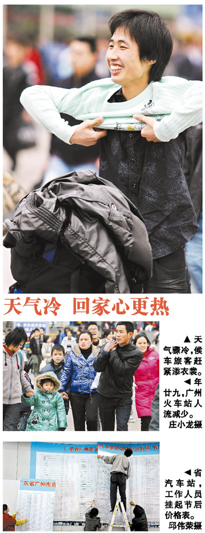 記者昨日在廣州火車站看到,廣場(chǎng)上仍有不少拉著行李準(zhǔn)備返鄉(xiāng)過春節(jié)的末班車,不過,相比前日密密麻麻的人流,昨日已經(jīng)好多了,記者采訪了下午1時(shí)乘坐火車的黃為民,他告訴記者,從到火車站公交站,再驗(yàn)票進(jìn)站,總共花了不到10分鐘。在廣州火車站廣場(chǎng)上設(shè)置的24小時(shí)候車區(qū)也已經(jīng)撤掉。