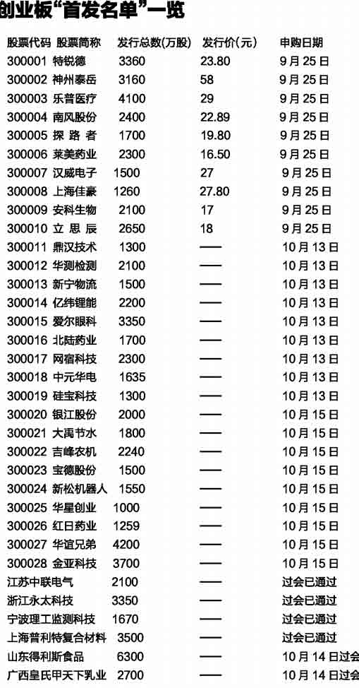 昨天,第三批創(chuàng)業(yè)板企業(yè)再獲IPO批文。華誼兄弟等9家企業(yè)發(fā)布招股意向書(shū),昨天起進(jìn)行網(wǎng)上路演、初步詢價(jià)和現(xiàn)場(chǎng)推介,10月13日確定發(fā)行價(jià)格,10月15日集中申購(gòu)。自創(chuàng)業(yè)板開(kāi)閘以來(lái),已有28家企業(yè)相繼進(jìn)入招股程序,掛牌上市指日可待。分析人士指出,這28家公司將是創(chuàng)業(yè)板開(kāi)市“首發(fā)名單”。