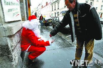 這不是某個電影的劇照,而是發(fā)生在法國雷恩的真實一幕。配圖的介紹說,趕上金融危機,“圣誕老人”也缺錢,為了籌錢分發(fā)禮物,開始在街上乞討。