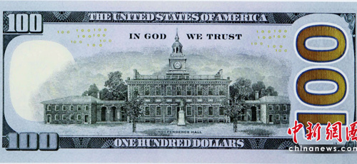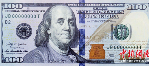 美國財政部公布了新版100元美鈔的照片,鈔票上同樣仍是美國開國元老之一的富蘭克林(Benjamin Franklin)肖像,但鈔票正中央多了一道藍(lán)色的3D立體安全圖樣,隨著角度不同,可以變換鐘或數(shù)字100的圖型。