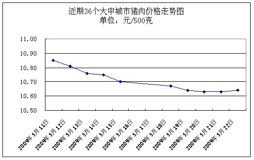 中新網(wǎng)5月25日電 據(jù)國(guó)家發(fā)改委網(wǎng)站消息,據(jù)國(guó)家發(fā)展改革委價(jià)格監(jiān)測(cè)中心監(jiān)測(cè),上周(2009.5.18-2009.5.22,下同)36個(gè)大中城市集市、超市豬肉(精瘦肉)平均零售價(jià)格每500克為10.64元,與前一周(2009.5.11-2009.5.15,下同)相比下降1.21%。