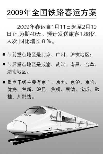 鐵道部8日宣布,2009年全國鐵路春運自1月11日起至2月19日止,為期40天,其中春節(jié)前15天,節(jié)后25天。
