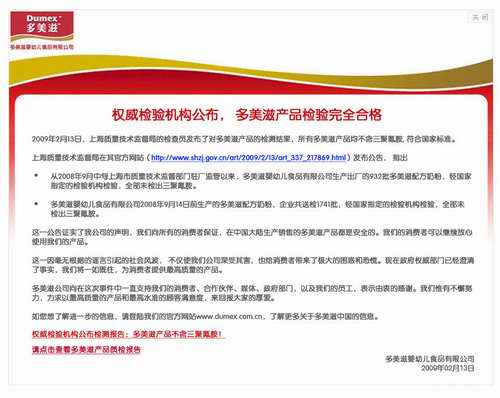 對于報(bào)道中介紹的那些患兒,我深表關(guān)切,我們理解父母們擔(dān)憂的心情。但迄今沒有醫(yī)學(xué)報(bào)告可以證明任何多美滋產(chǎn)品與這些病癥的關(guān)聯(lián)性。我想再次向我們的員工申明,多美滋在國內(nèi)生產(chǎn)銷售的奶粉全部符合中國相關(guān)標(biāo)準(zhǔn)。所有批次的產(chǎn)品都經(jīng)過了官方認(rèn)證的實(shí)驗(yàn)室的檢驗(yàn),被確認(rèn)不含三聚氰胺。同時(shí),質(zhì)檢系統(tǒng)駐廠人員還在對我們(當(dāng)然還有其它所有的乳品品牌)的生產(chǎn)和產(chǎn)品質(zhì)量進(jìn)行不間斷的監(jiān)督。