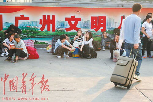 2月6日,正月十二。春節(jié)期間侵襲珠三角的寒潮剛剛過去。廣州火車站門前的廣場(chǎng)上,到處是肩挑背扛、行色匆匆的旅客。還有很多人散坐在廣場(chǎng)上,等待回鄉(xiāng)或者進(jìn)入珠三角腹地。