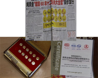 最近,北京多家知名媒體刊登大幅廣告,以著名書畫大師范曾的名義推銷純黃金“建國60年十二生肖大全套”,廣告中不僅聲稱耗用了68.6克純黃金鑄造了12枚純金生肖和巨幅畫卷,同時(shí),還宣稱這是中國金幣史上第一套“建國十二生肖”的大全套。