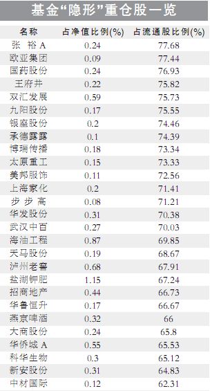 但最引人關注的,還是各基金合計持有超過上市公司流通盤70%的股票。上述股票的流通盤已經(jīng)幾乎被各家基金完全瓜分,因而成為最純粹的“基金重倉股”。也就是通常所說的“基金全控盤”股票。