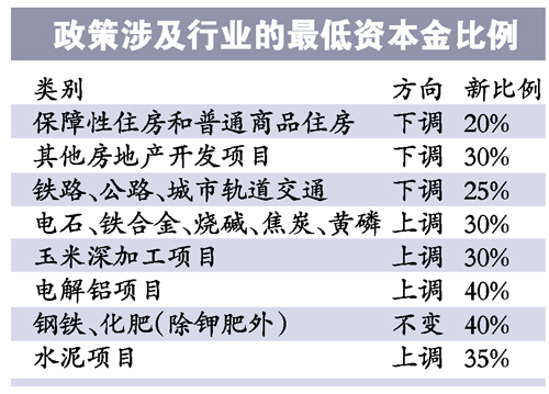 根據(jù)此次調(diào)整,大部分行業(yè)的最低資本金比例下調(diào)了5~10個百分點(diǎn),其中保障性住房和普通商品住房項目下調(diào)15個百分點(diǎn),大大超出此前的預(yù)期,而鐵路、公路等交通和大型基建項目也是此次資本金比例調(diào)整的主要受益對象。高污染、高能耗和產(chǎn)能過剩的項目則被上調(diào)最低資本金比例。