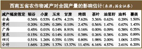 國金證券預測,西南五省甘蔗、水稻、烤煙產(chǎn)量在全國占比分別達78.19%、21.79%、53%,如果旱情持續(xù),勢必導致上述農(nóng)作物大幅減產(chǎn)。供求關(guān)系的改變,可能將推高相關(guān)農(nóng)產(chǎn)品價格。