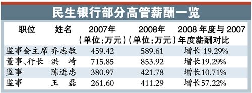 民生銀行的高管薪酬一直在銀行業(yè)中令人艷羨。2008年,民生銀行高管薪酬較2007年整體下降15%,其中,董事長(zhǎng)董文標(biāo)領(lǐng)薪1136.6萬(wàn)元,比上年減少612.02萬(wàn)元,下降35%;執(zhí)行董事、行長(zhǎng)王浵世下降10%至904.15萬(wàn)元,副行長(zhǎng)邵平、梁玉堂等薪酬均下降至589.61萬(wàn)元,其他高管也分別下降10%~15%。