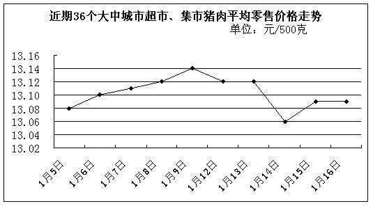 中新網(wǎng)1月19日電 據(jù)國家發(fā)展改革委價格監(jiān)測中心監(jiān)測,上周(1月12日-1月16日)36個大中城市超市、集市豬肉(精瘦肉)平均零售價格每500克為13.10元,比前一周(1月5日-1月9日,下同)下降0.08%。