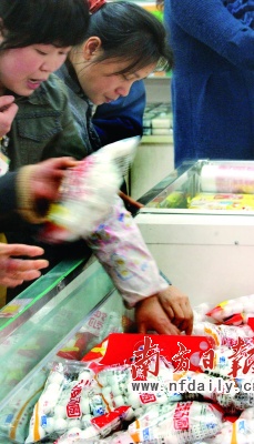 昨日,記者走訪家樂(lè)福、華潤(rùn)萬(wàn)家、吉之島等各大超市,看到各大賣場(chǎng)已經(jīng)摩拳擦掌開(kāi)始元宵特賣,紛紛在賣場(chǎng)內(nèi)開(kāi)辟湯圓特賣區(qū),廣州市場(chǎng)上湯圓的品種也多達(dá)70多種,口味主要有芝麻、花生、鮮肉、黑糯米等10多個(gè)。據(jù)介紹,芝麻、花生等傳統(tǒng)口味湯圓仍最受消費(fèi)者歡迎,而一些速凍食品企業(yè)為吸引年輕消費(fèi)群體,也推出巧克力、香橙等新口味的湯圓。業(yè)內(nèi)人士介紹,從品牌上來(lái)看,思念、三全、灣仔三大品牌的湯圓銷量最好,占銷售總量的六成以上。